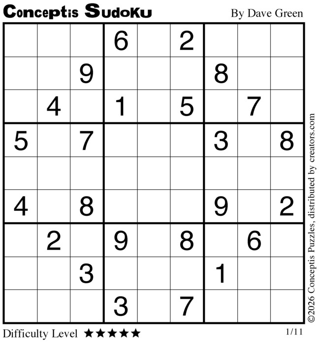 Each puzzle consists of a 9x9 grid containing given clues in various places. The object is to fill all empty squares so that the numbers 1 to 9 appear exactly once in each row, column and 3x3 box.
